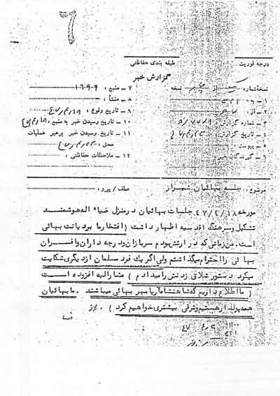 | توضيحات: | موضوع: جلسه بهائيان شيراز مورخه 18/4/47 جلسات بهائيان در منزل ضيأاله هوشمند تشكيل و سرهنگ اقدسيه اظهار داشت: «افتخار ما بر ديانت بهائي است. من زماني كه در ارتش بودم سربازان و درجهداران و افسران بهائي را احترام ميگذاشتم ولي اگر يك فرد مسلمان از ديگري شكايت ميكرد، دستور شلاق زدنش را ميدادم.» مشاراليه افزوده است: «ما اطلاع داريم كه شاهنشاه آريا مهر بهائي ميباشند. ما بهائيان همه پولدار هستيم و ترقي بيشتري خواهيم كرد.» |